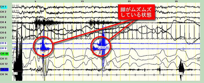 「周期性四肢運動障害」の場合、睡眠パターンと左右の足筋電図で異常運動を検査することにより、睡眠1時間あたりに出現する足の異常運動の回数であるPLM Indexを算出して重症度を判定します。