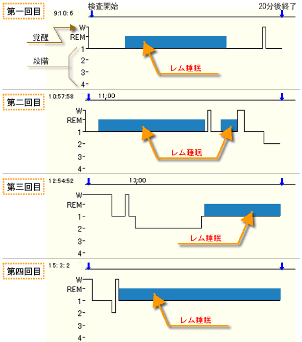 「ナルコレプシー」など「過眠症」の場合、1日に5回、短時間の睡眠検査を行います。これをMSLT検査といいます。日中の眠気を検査するとともに、5回中2回以上寝入りからレム睡眠が出現すると「ナルコレプシー」の疑いが強くなります。
