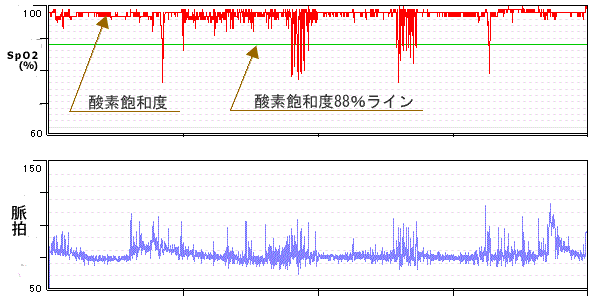 「睡眠時無呼吸症候群」があると、睡眠中の一過性無呼吸や低呼吸によって、瞬間的に動脈血酸素飽和度が低下します。同時に脈拍も乱れます。